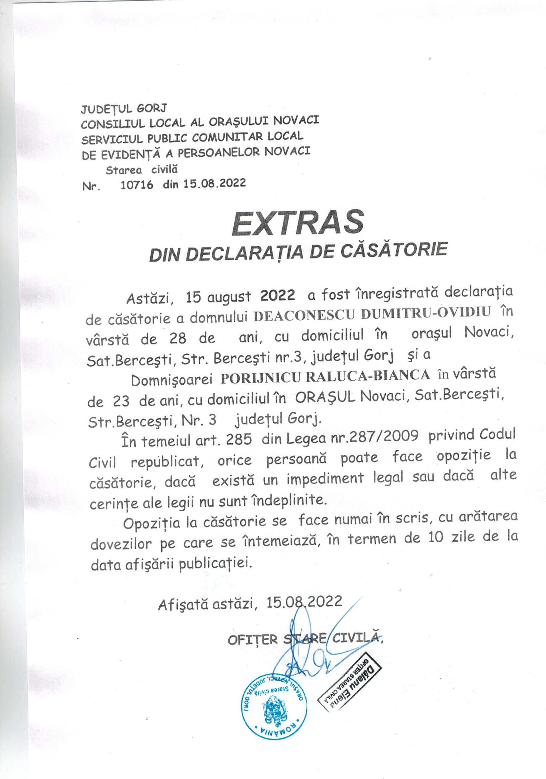 Extras Căsătorie – Deaconescu Dumitru-Ovidiu și Porijnicu Raluca-Bianca